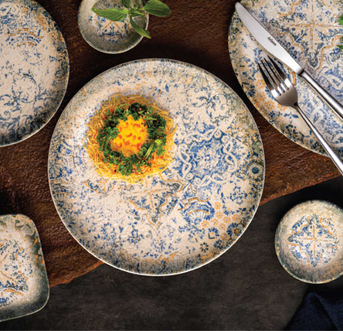 Palma is inspired by the sun-soaked island of Palma de Mallorca. The collection features earthy hues, weathered patterns, and layered textures, creating a rustic yet refined visual experience. Suitable for both relaxed tapas evenings and formal dining, Palma captures the spirit of the Mediterranean with its robust charm and artisan feel.